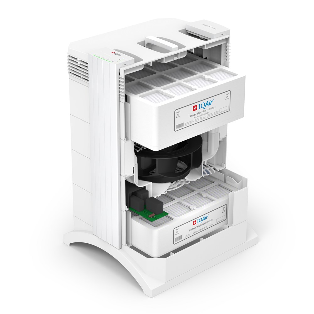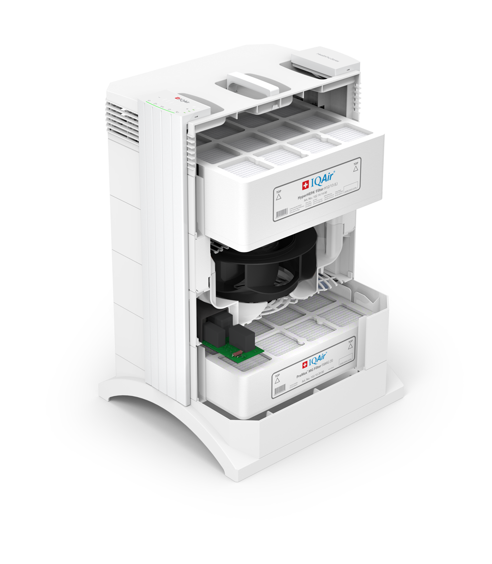 Through IQAir’s patented HyperHEPA clean-room-grade, high-efficiency particulate arresting filtration, the IQAir HealthPro 100 eliminates bacteria and viruses, as well as particulate air pollution from traffic, industry, tobacco smoke and more. The HealthPro 100’s HyperHEPA Filter has a CFC-free construction and a filtration efficiency of 99.97% for particles down to 0.3 micron and 99.5% for particles down to 0.003 micron. The media is a HEPA class H13 filter with a wet laid glass microfiber, mini-pleat design with inert thermoplastic separators. The large surface area of the HealthPro 100’s HyperHEPA Filter guarantees optimal filtration for up to 2 years under an average pollution level and speed setting.
