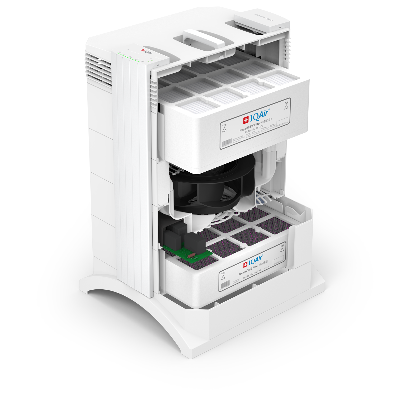 The large surface area of the HealthPro 150’s PreMax MG Filter, in combination with the leakage free design of all IQAir air purifiers, protects the fan and HyperHEPA filter from large particle pollution and premature loading.