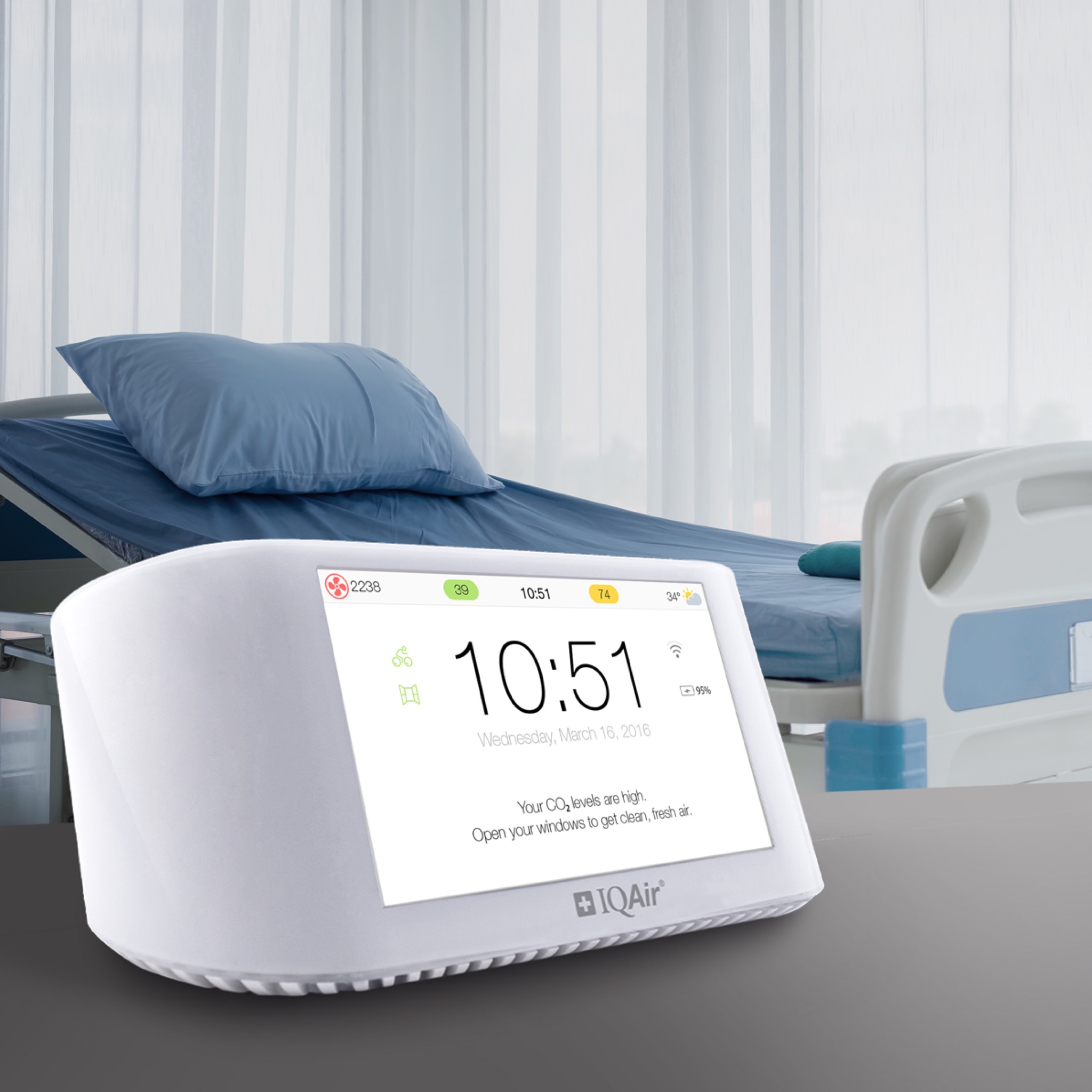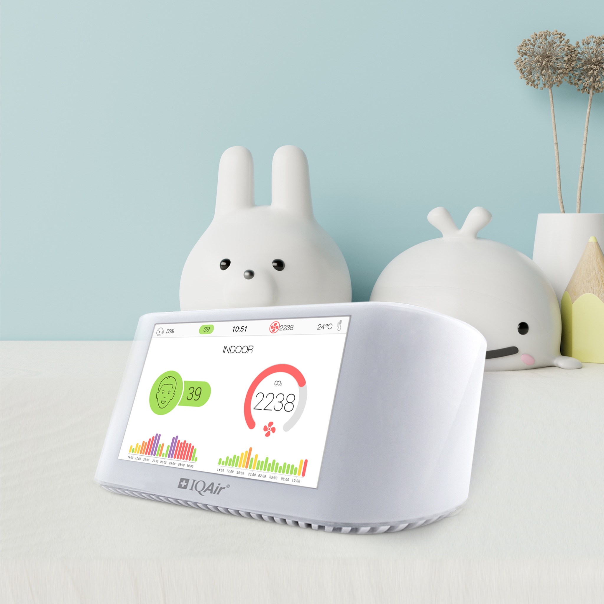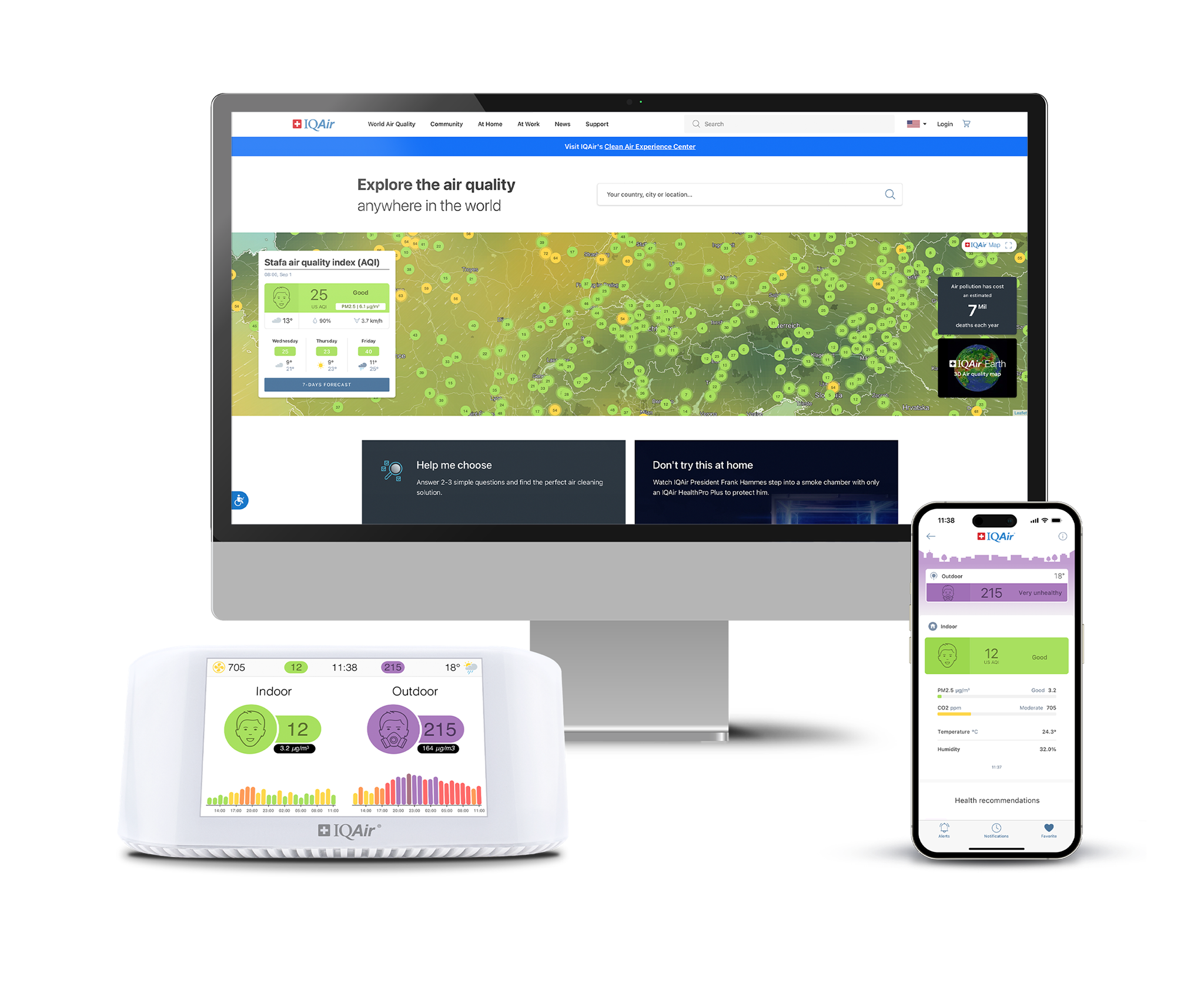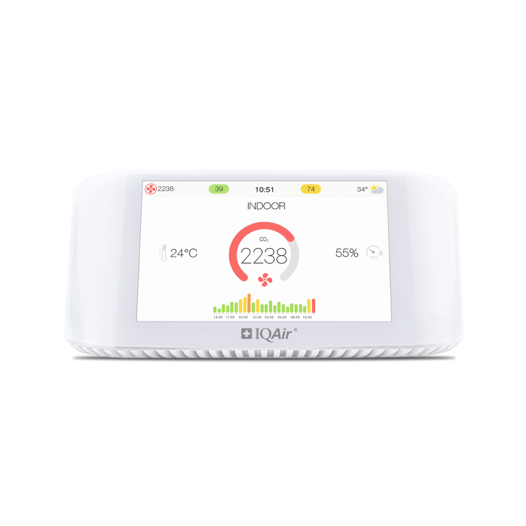 Мониторът за качество на въздуха IQAir AirVisual Pro е професионален лазерен монитор за качество на въздуха, който използва изкуствен интелект и високоточен PM2.5 лазерен сензор за измерване на замърсяването на въздуха във вашия дом или на работното място. AirVisual Pro открива фини и ултрафини прахови частици (напр. PM2.5), CO2, температура и нива на относителна влажност във вашата среда. Той разполага с ярък 5-инчов цветен дисплей и също така има придружаващо приложение, наречено „AirVisual“, което ви предоставя известия за качеството на въздуха. С AirVisual Pro можете също така да видите колко замърсен е външният въздух и да го сравните със собствената си среда. Световните нива на замърсяване също могат да бъдат преглеждани благодарение на мрежа от над 8000 мониторингови станции. Нивата на замърсяване на въздуха в помещенията и на открито се показват в реално време на цветния екран.