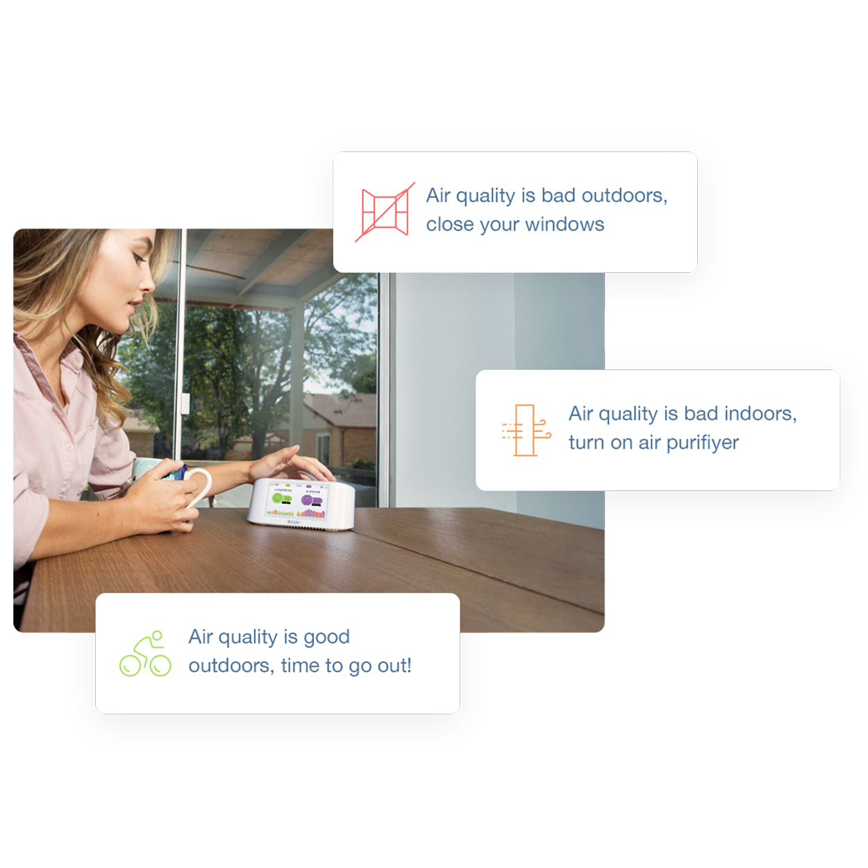 AirVisual Pro може да се свързва с мрежите на AirVisual чрез приложението Air Quality и онлайн, за да ви предостави здравни препоръки, които ви позволяват да вземате информирани решения как да намалите потенциалните рискове за здравето. Новини от общността за замърсяване на въздуха също са достъпни, така че да можете да сте в крак с новините за замърсяването на въздуха и медицинските открития.