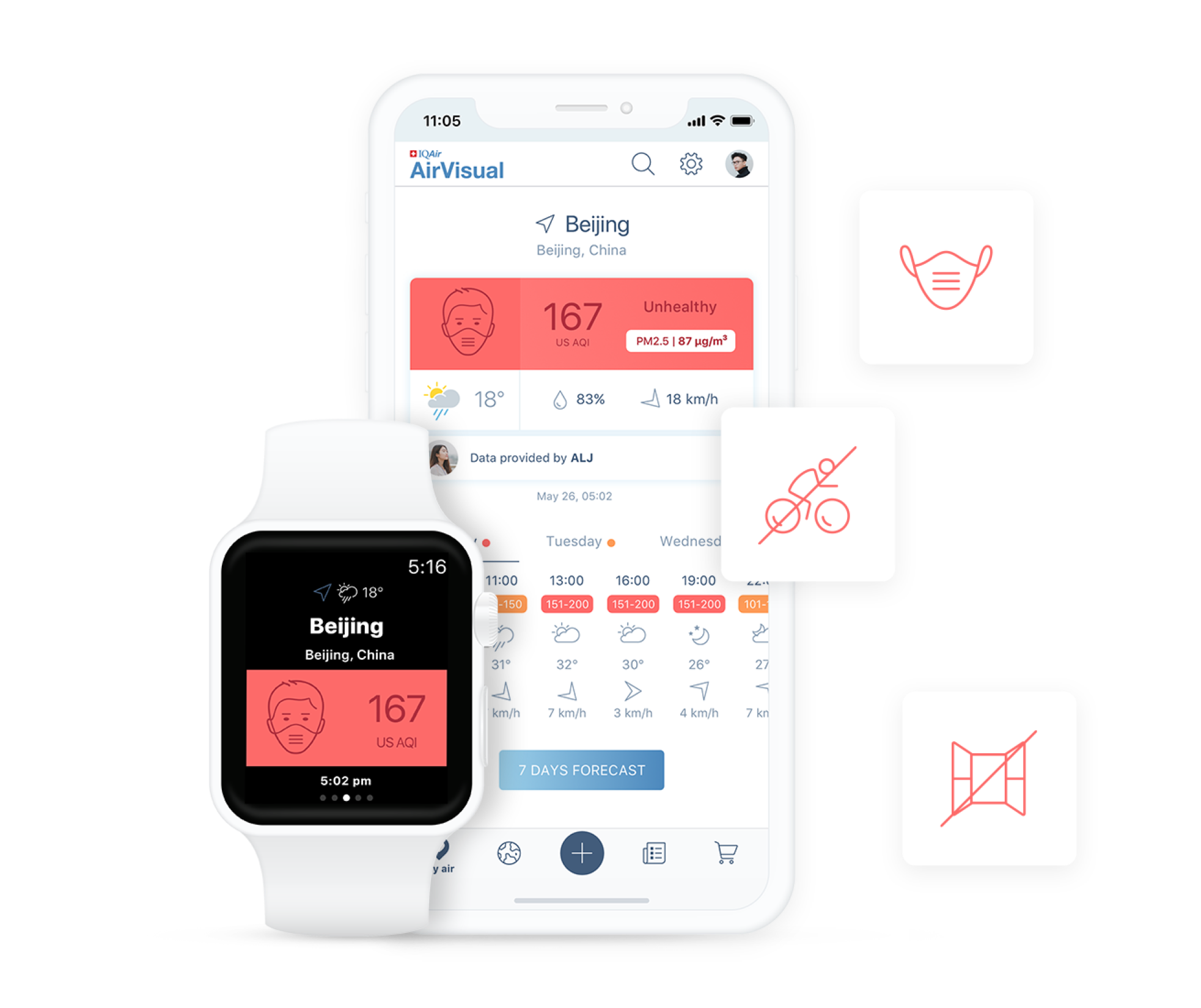 Приложението AirVisual може да предостави 3-дневна прогноза за замърсяването на въздуха и времето в повече от 5000 града по света. AirVisual използва „машинно обучение“, което е подмножество на изкуствения интелект, за да прогнозира замърсяването и времето, което след това се показва в приложението. Прогнозата за замърсяването и времето се показва на 3-часови интервали, като се показват също температура, влажност и скорост на вятъра.