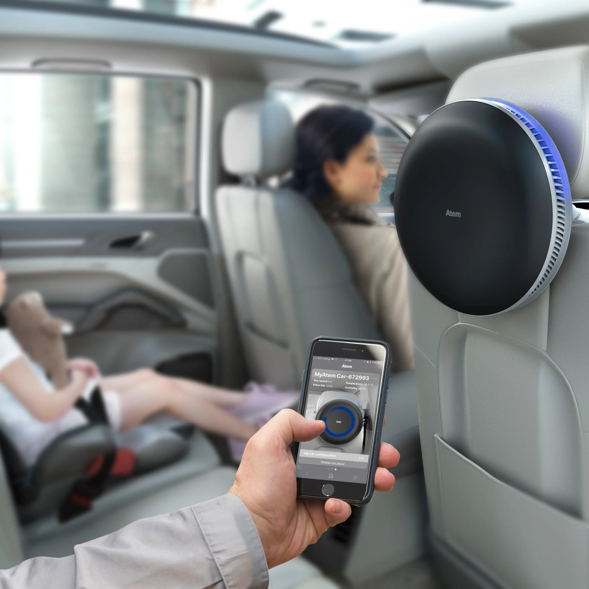 Пречиствателят на въздух IQAir Atem Car разполага с мощен вентилатор, който може да осигури до 62 м/3 чист въздух на час. Пречиствателят Atem Car също така разполага с автоматична система за активиране при поставяне на ключа в запалването, което ви спестява усилието да включвате/изключвате ръчно Atem Car. Пречиствателят Atem Car разполага с три различни настройки на скоростта на вентилатора, индикатор за живот на филтъра и може да се управлява чрез приложението ‘Atem’. Допълнителна функционалност, като персонализирани настройки на скоростта на вентилатора и функция за детска защита, също е налична.
