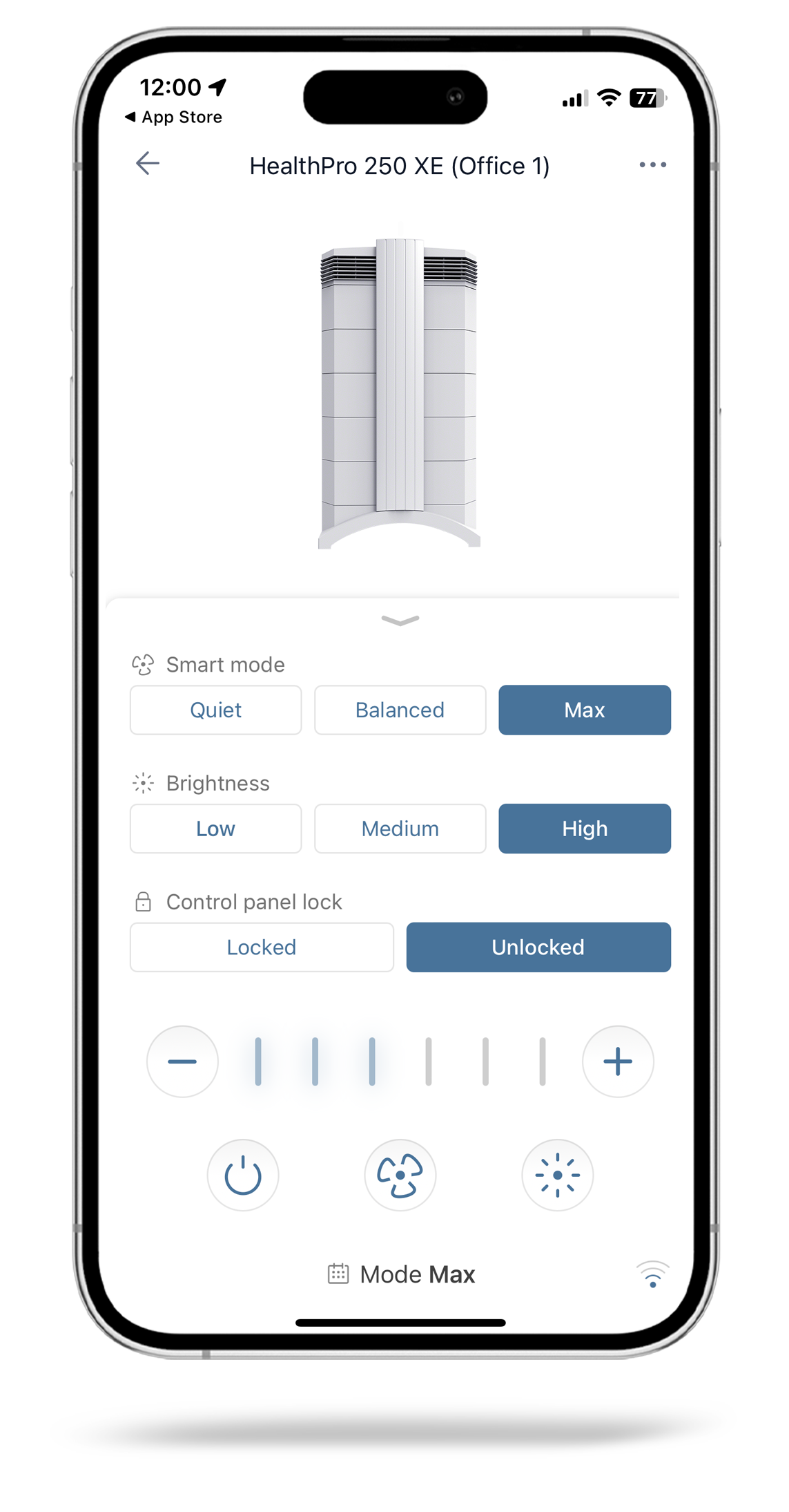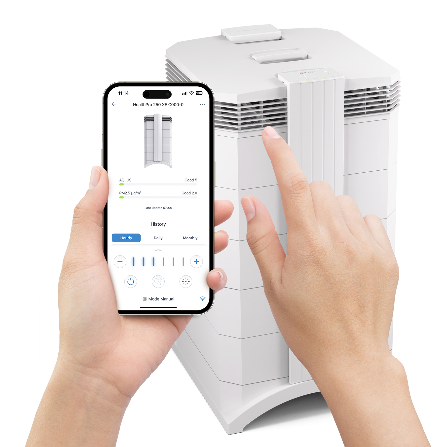Вграденият PM2.5 сензор в HealthPro 250 XE непрекъснато следи качеството на въздуха и автоматично регулира скоростта на вентилатора въз основа на нивата на замърсяване в помещенията, открити в твоя дом.