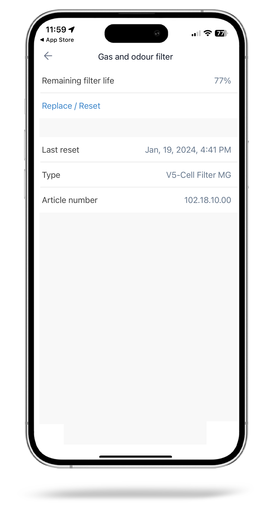 Разширено наблюдение на филтъра – снимка на екрана на приложението HP250 XE – оставащ живот на филтъра V5-Cell